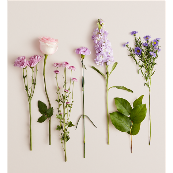 EXCLUSIVE Just like a daydream. Our delightful lavender bouquet is gathered with accents of pink and lush greenery in an embossed lavender vase that complements the delicate beauty of the blooms.